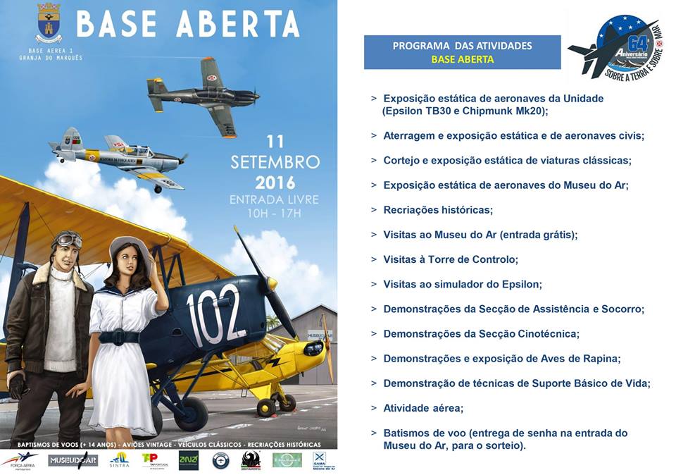 O Museu do Ar e a Base Aérea nº1 vão abrir as portas ao público no dia 11 de Setembro, entre as 10h00 e as 17h00 e a entrada é gratuita.