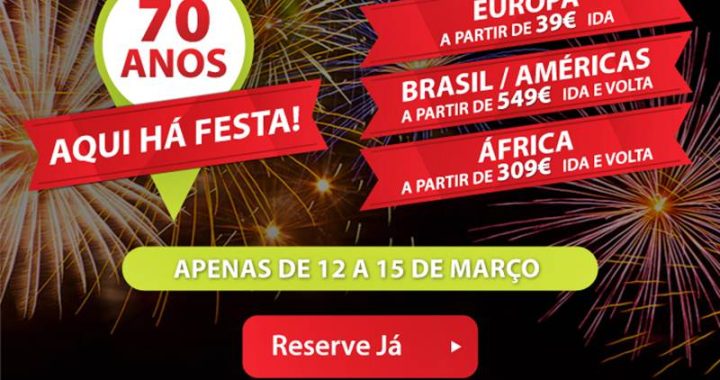 Campanha Comemorativa do Aniversário dos 70 anos da TAP Portugal com promoção de voos. Entre os dias 12 e 15 de Março vários destinos à escolha a partir de 39€. Promoção Últimos Dias 70 Anos TAP Portugal Com o mote Aqui Há Festa pode comprar bilhetes de avião para a Europa desde 39€ por percurso, África a partir de […]