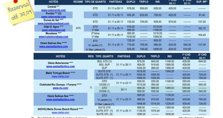 Promoção Férias na ilha do Sal em Cabo Verde no mês de Novembro 2014. Pacote de férias com estadia de 7 noites, partida de Lisboa aos sábados desde 579€ por pessoa e que inclui: Voos na Companhia Aérea TACV Lisboa / Sal / Lisboa em classe G com direito a 15Kg de bagagem; Transporte entre […]